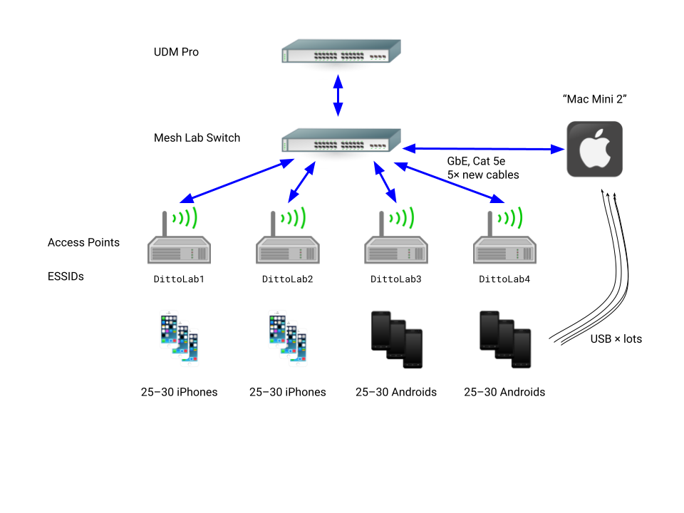 WiFi is very sensitive to interference and the number of clients. While Ditto does its best to be bandwidth-efficient, meshes are inherently more bandwidth-intensive than a typical hub-and-spoke server model. For larger meshes (eg. more than 30 devices), LAN issues can start to really play a role in performance degradation. Through our own testing, we’ve learned a couple of useful tips:- Avoid 2.4GHz when possible. It’s a very congested band.